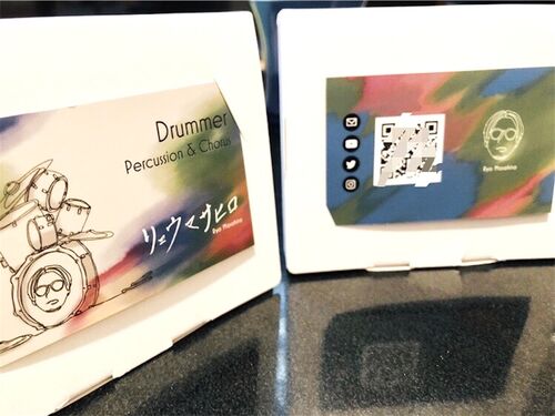 皆さん、おはようございます、こんにちは、こんばんは。ドラマーリョウマサヒロです。 この度、ドラマーとしての名刺が出来ました ※インターネットリテラシーとして一部ぼかし有り 今回はカードサイズ、名刺サイズの2パターンを作成しています。 こちら裏面…